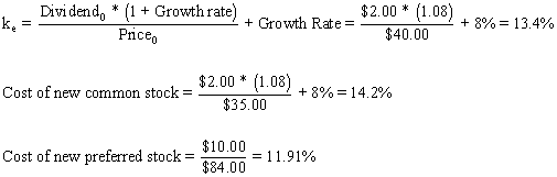Since the firm has adequate retained earnings to fund the equity portion of the capital expenditures, we would use the cost of retained earnings or existing common stock (13.4%) in finding the WACC.