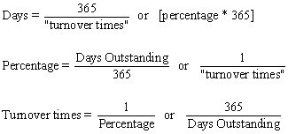 [For example; take annual sales of $1,277,500 and divide by 365 to get average days sales of $3500. The firm has an average accounts receivable balance of $141,000. The days sales outstanding would be $141,000/$3500 = 40.28 days. Divide this by 365 and you have 11.04% (which is the same as dividing receivables of $141,000 by sales of $1,277,500) or divide the 40.28 into 365 to get a 9.06 times per year turnover.]